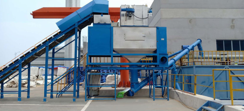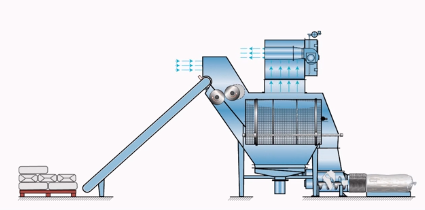 小袋自動(dòng)拆包機(jī)由人工或機(jī)器人將包裝袋放到輸送機(jī)上,進(jìn)行輸送到指定位置,或進(jìn)入破碎機(jī)后自動(dòng)拆包,物料自動(dòng)分離落入下游設(shè)備。廢袋自動(dòng)分離后自動(dòng)壓縮,拆包的過程中產(chǎn)生的揚(yáng)塵由過濾除塵器凈化過濾達(dá)標(biāo)后排出。