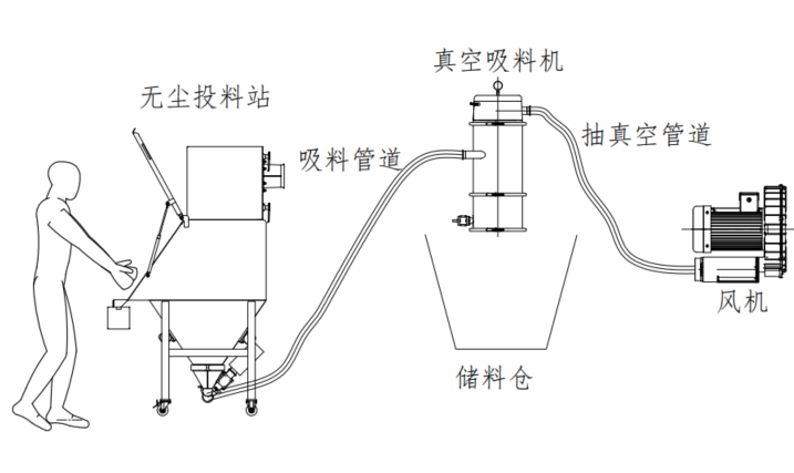 無塵投料站的工作原理是投料時產生的物料粉塵被離心風機或抽氣管道形成的負壓吸到過濾系統中,使物料與空氣分離,防止粉塵四散逃逸、污染周圍環境和保護操作者身體健康。